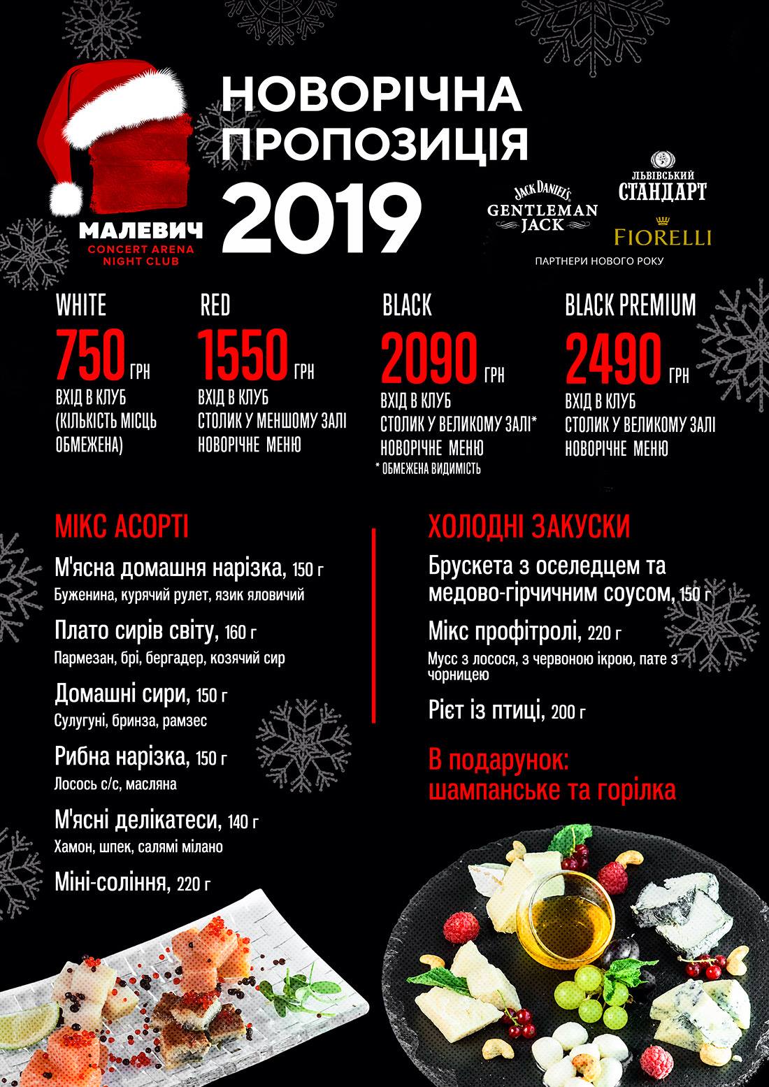Святкуй цей Новий Рік в Малевичі разом з неймовірними Antytila / Антитіла! Зустрінь 2019-й на драйві та в найкращій компанії! • Ведучий Новорічної Ночі – Micik Gonibez • Танцювальні постановки – Шоу Малевича Вартість: • white – 750 грн з 1 гостя – вхід в клуб в новорічну ніч (Увага! Кількість цих вхідних квитків обмежена! Купуй вже!) • red – 1 550 грн – вхід в клуб та столик в малому залі (з 1 гостя) • black – 2 090 грн – вхід в клуб та столик у великому залі, обмежена видимість сцени (з 1 гостя) • black premium – 2 490 грн – вхід в клуб та столик у великому залі (з 1 гостя) Партнери Нового року: • Львівський стандарт • Fiorelli • Gentelman Jack by Jack Daniels Ми починаємо 31 грудня о 21-й Вхід в клуб: дівчата 18+ хлопці 21+ Дізнатися більше та забронювати: з 12 до 19 щодня: +38097 5555 195 / +38050 5555 195 (viber) Приходь: пр-т Чорновола, 2 | |